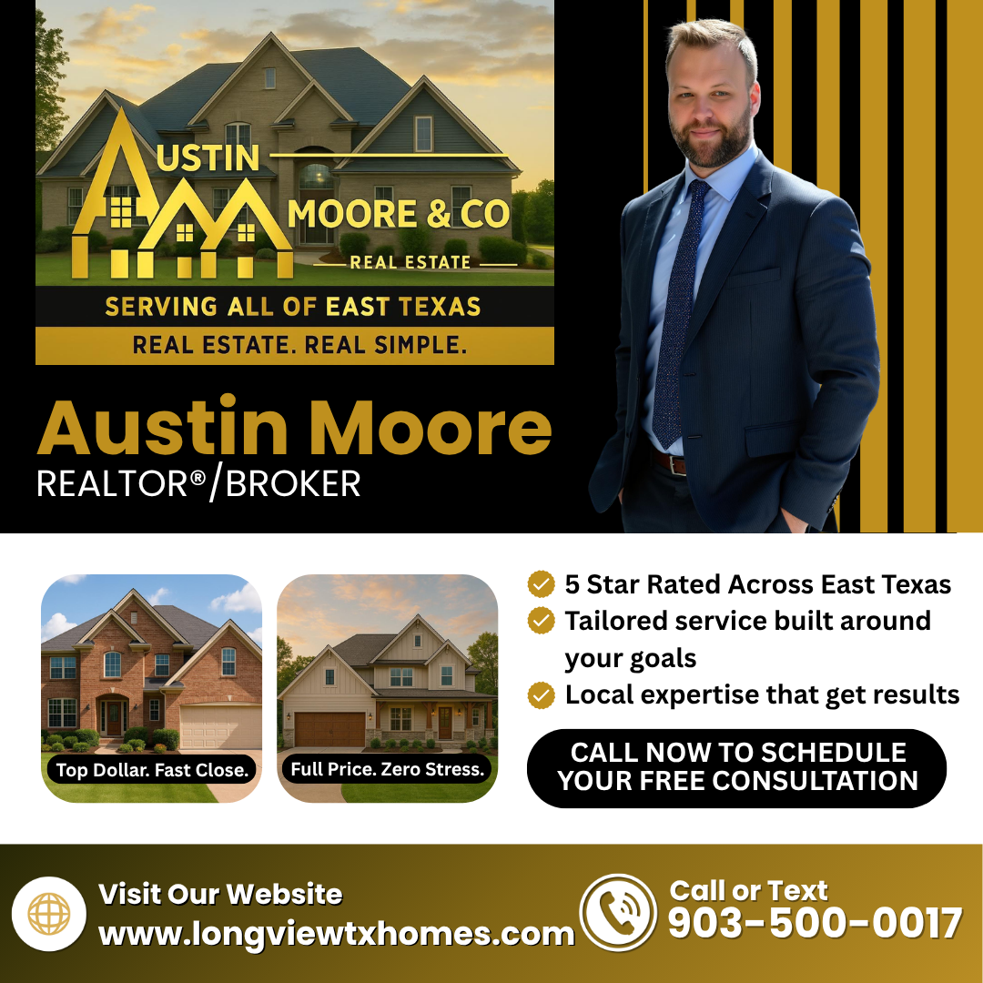 Austin Moore & Company Real Estate is proud to serve Longview and the surrounding East Texas communities with trusted, client-focused real estate services. Whether you’re buying your first home, selling a property, relocating, or investing, our team brings local expertise, market knowledge, and personalized service to every transaction. We specialize in residential homes, luxury properties, land & acreage, farm & ranch, and Lake Cherokee waterfront properties.